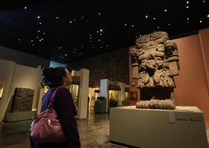 (251014) — CIUDAD DE MEXICO, 14 octubre, 2025 (Xinhua) — Imagen del 9 de octubre de 2025 de una mujer observando una pieza exhibida en el Museo Nacional de Antropología, en la Ciudad de México, capital de México. En el México indígena, el género y el principio femenino no eran categorías secundarias ni subordinadas, sino parte esencial de una concepción del mundo basada en la dualidad y el equilibrio, dijo a Xinhua la destacada curadora mexicana, Karina Romero Blanco. (Xinhua/Francisco Cañedo) (fc) (oa) (ah) (vf)