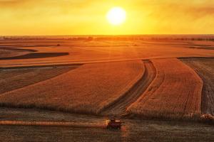 (251015) — MUDANJIANG, 15 octubre, 2025 (Xinhua) — Vista aérea tomada con un dron el 14 de octubre de 2025 de la cosecha bajo el atardecer, en la ciudad de Jiamusi, en la provincia de Heilongjiang, en el noreste de China. La cosecha de otoño en Heilongjiang, el principal productor de cereales de China, está en pleno apogeo. Hasta el 14 de octubre, Heilongjiang había completado la cosecha de aproximadamente 153,60 millones de mu (10,24 millones de hectáreas) de cultivos de cereales de otoño, lo que representa más del 60 por ciento del total. (Xinhua/Liu Wanping) (ah) (ra)