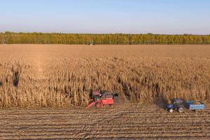 (251015) — MUDANJIANG, 15 octubre, 2025 (Xinhua) — Vista aérea tomada con un dron el 13 de octubre de 2025 de agricultores cosechando maíz, en la ciudad de Suihua, en la provincia de Heilongjiang, en el noreste de China. La cosecha de otoño en Heilongjiang, el principal productor de cereales de China, está en pleno apogeo. Hasta el 14 de octubre, Heilongjiang había completado la cosecha de aproximadamente 153,60 millones de mu (10,24 millones de hectáreas) de cultivos de cereales de otoño, lo que representa más del 60 por ciento del total. (Xinhua/Xie Jianfei) (ah) (ra)
