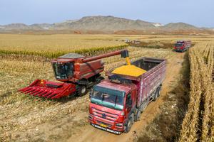 (251015) — BAYANNUR, 15 octubre, 2025 (Xinhua) — Vista aérea tomada con un dron de una segadora descargando maíz cosechado, en la bandera frontal de Urad, en Bayannur, en la región autónoma de Mongolia Interior, en el norte de China, el 15 de octubre de 2025. La bandera frontal de Urad en Bayannur ha entrado recientemente en la temporada de cosecha de otoño, con la agricultura mecanizada aplicada para mejorar la eficiencia. (Xinhua/Ma Jinrui) (jg) (da) (vf)