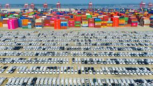 (251014) -- BEIJING, 14 octubre, 2025 (Xinhua) -- Vista aérea tomada con un dron el 4 de octubre de 2025 de automóviles listos para su envío y exportación en una área portuaria, en Nanjing, en la provincia de Jiangsu, en el este de China. El sector de los vehículos de nueva energía de China mantuvo un fuerte impulso en la producción y las ventas durante los primeros nueve meses del año, según los datos de la industria publicados el martes. (Xinhua/Yang Suping) (oa) (ah) (vf)