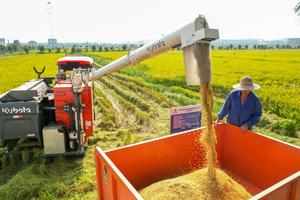 (251015) -- BEIJING, 15 octubre, 2025 (Xinhua) -- Imagen tomada con un dron el 15 de octubre de 2025 de un aldeano cargando arroz cosechado a un camión en una granja, en el poblado de Xin'an del distrito de Deqing, en la ciudad de Huzhou, en la provincia de Zhejiang, en el este de China. (Xinhua/Yao Haixiang) (jg) (da) (ce)