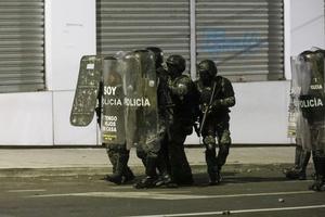 (251015) -- QUITO, 15 octubre, 2025 (Xinhua) -- Policías se cubren en un enfrentamiento con manifestantes durante una protesta en el marco del paro nacional, en Quito, capital de Ecuador, el 15 de octubre de 2025. (Xinhua/Ricardo Landeta) (rl) (vf) (ce)