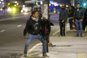 (251015) -- QUITO, 15 octubre, 2025 (Xinhua) -- Un hombre reacciona en un enfrentamiento con policías durante una protesta en el marco del paro nacional, en Quito, capital de Ecuador, el 15 de octubre de 2025. (Xinhua/Ricardo Landeta) (rl) (vf) (ce)