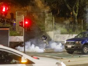 (251015) -- QUITO, 15 octubre, 2025 (Xinhua) -- Un hombre patea una lata de gas lacrimógeno en un enfrentamiento con policías durante una protesta en el marco del paro nacional, en Quito, capital de Ecuador, el 15 de octubre de 2025. (Xinhua/Ricardo Landeta) (rl) (vf) (ce)