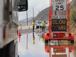 (251015) -- CALIFORNIA, 15 octubre, 2025 (Xinhua) -- Imagen del 14 de octubre de 2025 de trabajadores limpiando una calle inundada, cerca de Malibú, en el condado de Los Angeles, California, Estados Unidos. Fuertes tormentas eléctricas azotaron gran parte del suroeste de California el martes, provocando fuertes lluvias, inundaciones repentinas y riesgos de corrimientos de escombros en la región. (Xinhua/Qiu Chen) (jg) (da) (ce)