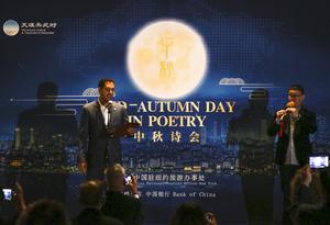 (251014) — NACIONES UNIDAS, 14 octubre de 2025 (Xinhua) — Imagen del 13 de octubre de 2025 del miembro del Consejo Municipal de la ciudad de Nueva York, Christopher Marte recitando bilingüe el poema “Pensamientos en una noche tranquila”, del poeta chino, Li Bai, de la dinastía Tang, en la sede de la Organización de las Naciones Unidas (ONU), en Nueva York. La celebración del “Día del Medio Otoño en Poesía” de 2025 iluminó la sede de la ONU con el espíritu de reencuentro, armonía e intercambio cultural el lunes por la noche. (Xinhua/Zhang Fengguo) (oa) (ah) (vf)