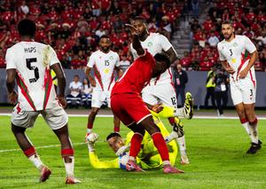 (251015) — CIUDAD DE PANAMA, 15 octubre, 2025 (Xinhua) — Imagen del 14 de octubre de 2025 del guardameta Etienne Vaessen (abajo), de Surinam, atajando el balón durante el partido ante Panamá correspondiente a las Eliminatorias para el Mundial de Estados Unidos, México y Canadá 2026, celebrado en el Estadio Rommel Fernández, en la Ciudad de Panamá, capital de Panamá. (Xinhua/Xu Yongzheng) (ah) (ra) (vf)