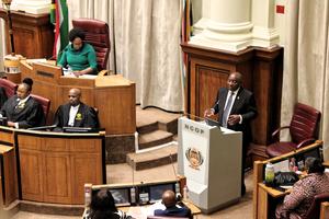 (251015) — CIUDAD DEL CABO, 15 octubre, 2025 (Xinhua) — Imagen del 14 de octubre de 2025 del presidente de Sudáfrica, Cyril Ramaphosa, hablando mientras responde a preguntas en el Consejo Nacional de Provincias, en el Parlamento, en Ciudad del Cabo, Sudáfrica. Ramaphosa dijo el martes que aunque el reciente acuerdo de paz para Gaza es bienvenido, esto no afecta el caso del país en contra de Israel en la Corte Internacional de Justicia. (Xinhua/Shakirah Thebus) (jg) (da) (ce)