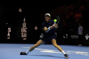 (251016) — RIAD, 16 octubre, 2025 (Xinhua) — Imagen del 15 de octubre de 2025 de Jannik Sinner, de Italia, devolviendo la pelota durante el partido de cuartos de final ante Stefanos Tsitsipas, de Grecia, en el torneo de tenis Six Kings Slam, en Riad, Arabia Saudita. (Xinhua/Wang Haizhou) (da) (ra) (ce)