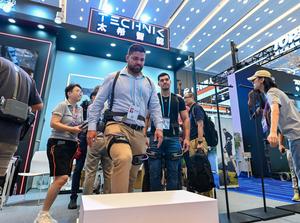 (251016) -- GUANGZHOU, 16 octubre, 2025 (Xinhua) -- Imagen del 15 de octubre de 2025 de un comprador extranjero probando un robot exoesqueleto para escalada de montaña en el estand de Hangzhou Technik Technology Co., Ltd. en la Zona de Robots de Servicio durante la 138ª edición de la Feria de Importación y Exportación de China (Feria de Cantón), en Guangzhou, en la provincia de Guangdong, en el sur de China. La feria destaca la Zona de Robots de Servicio para mostrar innovaciones de vanguardia, como robots humanoides, robots exoesqueleto, robots de patrullaje esféricos, robots de limpieza fotovoltaicos, robots educativos, etc. (Xinhua/Xiao Ennan) (rtg) (ra) (vf)