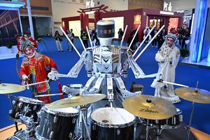 (251016) -- QINGDAO, 16 octubre, 2025 (Xinhua) -- Un robot toca la batería en la décima Exposición Internacional de los Derechos de Autor de China, en Qingdao, en la provincia de Shandong, en el este de China, el 16 de octubre de 2025. Con el tema "La Inteligencia Digital Lidera el Futuro, los Derechos de Autor Promueven el Desarrollo Innovador", la décima Exposición Internacional de los Derechos de Autor de China y el Foro Internacional de los Derechos de Autor 2025 se inauguraron el jueves en Qingdao. (Xinhua/Li Ziheng) (da) (ra) (vf)