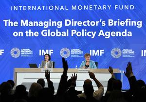 (251016) -- WASHINGTON, 16 octubre, 2025 (Xinhua) -- La directora gerente del Fondo Monetario Internacional (FMI), Kristalina Georgieva (d), responde preguntas en su conferencia de prensa sobre la Agenda Política Global, en Washington, D.C., Estados Unidos, el 16 de octubre de 2025. (Xinhua/Li Rui) (jg) (ah) (ce)
