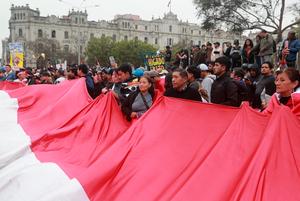 (251016) -- LIMA, 16 octubre, 2025 (Xinhua) -- Imagen del 15 de octubre de 2025 de personas sosteniendo una bandera nacional peruana en una manifestación durante una movilización nacional contra el Gobierno de transición y contra el Congreso Nacional, en Lima, Perú. (Xinhua/Mariana Bazo) (mb) (jg) (ah) (ce)