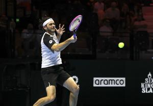 (251017) -- RIAD, 17 octubre, 2025 (Xinhua) -- Imagen del 16 de octubre de 2025 de Taylor Fritz, de Estados Unidos, devolviendo la pelota durante el partido de semifinal ante Carlos Alcaraz, de España, en el torneo de tenis Six Kings Slam, en Riad, Arabia Saudita. (Xinhua/Luo Chen) (oa) (ra) (ce)