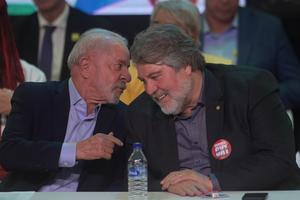 (251017) — BRASILIA, 17 octubre, 2025 (Xinhua) — Imagen del 16 de octubre de 2025 del presidente brasileño, Luiz Inácio Lula da Silva (i), conversando con el diputado federal brasileño, Renildo Calheiros (d), durante el congreso nacional del Partido Comunista de Brasil, en Brasilia, Brasil. Lula da Silva defendió el jueves a Venezuela ante el incremento de las acciones del Gobierno del presidente estadounidense, Donald Trump, en relación con el país sudamericano, y reiteró que ningún mandatario extranjero tiene derecho a interferir en sus asuntos internos. (Xinhua/Lucio Tavora) (lt) (jg) (da) (ce)