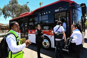 (251017) -- COPIAPO, 17 octubre, 2025 (Xinhua) -- Imagen del 16 de octubre de 2025 de personas abordando un autobús durante la ceremonia de inauguración de los autobuses eléctricos de la marca china King Long llevada a cabo en el Parque El Petril, en la ciudad de Copiapó, en la región de Atacama, Chile. En el oasis de Copiapó, en el corazón del desierto chileno de Atacama, uno de los más áridos del mundo, inició el jueves la operación de 121 autobuses eléctricos, todos de origen chino. (Xinhua/Jorge Villegas) (jv) (jg) (da) (ce)
