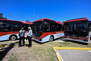 (251017) — COPIAPO, 17 octubre, 2025 (Xinhua) — Imagen del 16 de octubre de 2025 de conductores asistiendo a la ceremonia de inauguración de los autobuses eléctricos de la marca china King Long llevada a cabo en el Parque El Petril, en la ciudad de Copiapó, en la región de Atacama, Chile. En el oasis de Copiapó, en el corazón del desierto chileno de Atacama, uno de los más áridos del mundo, inició el jueves la operación de 121 autobuses eléctricos, todos de origen chino. (Xinhua/Jorge Villegas) (jv) (jg) (da) (ce)