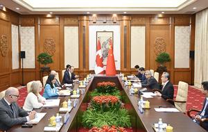 (251017) -- BEIJING, 17 octubre, 2025 (Xinhua) -- El ministro de Relaciones Exteriores chino, Wang Yi, quien también es miembro del Buró Político del Comité Central del Partido Comunista de China, sostiene conversaciones con su homóloga canadiense, Anita Anand, en Beijing, capital de China, el 17 de octubre de 2025. (Xinhua/Yue Yuewei) (jg) (da) (ce)