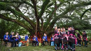 (251017) -- SANJIANG, 17 octubre, 2025 (Xinhua) -- Personas del grupo étnico dong se preparan para realizar una presentación, en la aldea de Chankou del poblado de Liangkou, en el distrito autónomo dong de Sanjiang, en la región autónoma de la etnia zhuang de Guangxi, en el sur de China, el 17 de octubre de 2025. El viernes se celebraron diversas actividades para festejar la cosecha en la aldea de Chankou. (Xinhua/Zhang Ailin) (oa) (ra) (ce)