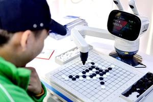 (251017) -- SHIJIAZHUANG, 17 octubre, 2025 (Xinhua) -- Un visitante juega al gobang con un robot durante la Exposición Internacional de Economía Digital de China 2025, en Shijiazhuang, en la provincia de Hebei, en el norte de China, el 17 de octubre de 2025. La exposición comenzó aquí el viernes y durará hasta el 19 de octubre. (Xinhua/Wang Xiao) (jg) (da)