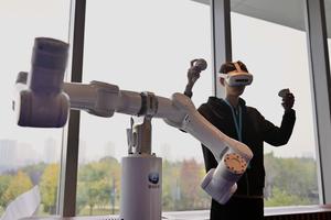 (251017) -- SHENYANG, 17 octubre, 2025 (Xinhua) -- Un trabajador realiza una demostración de un brazo humanoide en la Conferencia de Robótica de Shenyang 2025, en Shenyang, en la provincia de Liaoning, en el noreste de China, el 17 de octubre de 2025. El evento de dos días comenzó aquí el viernes. (Xinhua/Wu Qinghao) (jg) (da) (vf)