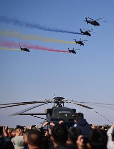 (251018) -- TIANJIN, 18 octubre, 2025 (Xinhua) -- Helicópteros del equipo de acrobacias aéreas Fenglei del Ejército Popular de Liberación de China realizan una presentación durante la séptima Exposición de Helicópteros de China, en la municipalidad de Tianjin, en el norte de China, el 18 de octubre de 2025. La exposición abrió sus puertas al público general el sábado. (Xinhua/Li Ran) (oa) (da)