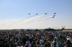 (251018) -- TIANJIN, 18 octubre, 2025 (Xinhua) -- Helicópteros del equipo de acrobacias aéreas Fenglei del Ejército Popular de Liberación de China realizan una presentación durante la séptima Exposición de Helicópteros de China, en la municipalidad de Tianjin, en el norte de China, el 18 de octubre de 2025. La exposición abrió sus puertas al público general el sábado. (Xinhua/Sun Fanyue) (oa) (da)