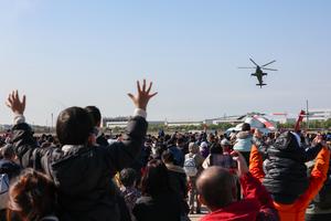 (251018) -- TIANJIN, 18 octubre, 2025 (Xinhua) -- Personas observan cómo un helicóptero Z-10 finaliza una presentación durante la séptima Exposición de Helicópteros de China, en la municipalidad de Tianjin, en el norte de China, el 18 de octubre de 2025. La exposición abrió sus puertas al público general el sábado. (Xinhua/Sun Fanyue) (oa) (da)