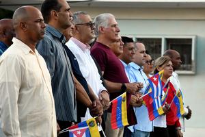 (251017) — LA HABANA, 17 octubre, 2025 (Xinhua) — El presidente cubano, Miguel Díaz-Canel (5-i), asiste al acto de apoyo a la causa venezolana y de rechazo a la injerencia de Estados Unidos, en La Habana, capital de Cuba, el 17 de octubre de 2025. Miles de cubanos se dieron cita el viernes en la ciudad de La Habana, para ratificar su solidaridad con el pueblo y el Gobierno de Venezuela, ante la escalada injerencista de Estados Unidos contra la nación sudamericana. (Xinhua/Joaquín Hernández) (jh) (oa) (ra) (ce)