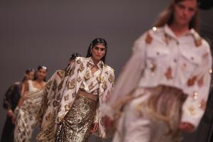 (251018) -- CIUDAD DE MEXICO, 18 octubre, 2025 (Xinhua) -- Imagen del 17 de octubre de 2025 de modelos presentando creaciones de Josefina by Vero Solís durante la Volvo Fashion Week México 2025, en la Ciudad de México, capital de México. (Xinhua/Francisco Cañedo) (fc) (oa) (da)
