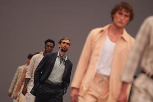 (251018) — CIUDAD DE MEXICO, 18 octubre, 2025 (Xinhua) — Imagen del 17 de octubre de 2025 de modelos presentando creaciones de Harris & Frank durante la Volvo Fashion Week México 2025, en la Ciudad de México, capital de México. (Xinhua/Francisco Cañedo) (fc) (oa) (da)