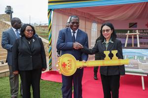 (251017) -- DAR ES SALAAM, 17 octubre, 2025 (Xinhua) -- El vicepresidente de Tanzania, Philip Mpango (2-d), estrecha la mano de la embajadora china en Tanzania, Chen Mingjian (d), durante la ceremonia de entrega del Geoparque Ngorongoro-Lengai, financiado por China, en Arusha, Tanzania, el 16 de octubre de 2025. Mpango inauguró oficialmente el jueves el Geoparque Ngorongoro-Lengai, una moderna instalación construida con ayuda china para promover la investigación geológica, la conservación del patrimonio y el desarrollo turístico. (Xinhua/Emmanuel Herman) (jg) (da) (vf)