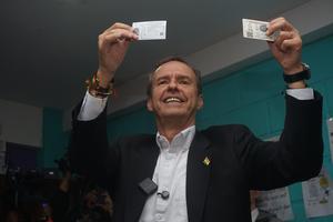 (251019) -- LA PAZ, 19 octubre, 2025 (Xinhua) -- El candidato a la Presidencia de Bolivia por el partido Alianza Libre, Jorge "Tuto" Quiroga, muestra su carnet electoral después de emitir su voto en un colegio electoral, en la ciudad de La Paz, Bolivia, el 19 de octubre de 2025. Bolivia abrió el domingo a las 08:00 hora local las mesas de sufragio para iniciar la votación en histórica segunda vuelta presidencial con el fin de elegir a sus nuevos gobernantes, con ocho horas de votación y 7.567.207 de ciudadanos habilitados en el país y 369.931 en 22 naciones en el exterior. (Xinhua/Javier Mamani) (jm) (ah) (da)