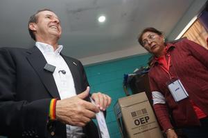 (251019) -- LA PAZ, 19 octubre, 2025 (Xinhua) -- El candidato a la Presidencia de Bolivia por el partido Alianza Libre, Jorge "Tuto" Quiroga (i), sonríe mientras se retira después de emitir su voto en un colegio electoral, en la ciudad de La Paz, Bolivia, el 19 de octubre de 2025. Bolivia abrió el domingo a las 08:00 hora local las mesas de sufragio para iniciar la votación en la histórica segunda vuelta presidencial con el fin de elegir a sus nuevos gobernantes, con ocho horas de votación y 7.567.207 de ciudadanos habilitados en el país y 369.931 en 22 naciones en el exterior. (Xinhua/Javier Mamani) (jm) (ah) (da)