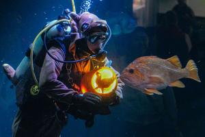 (251019) -- VANCOUVER, 19 octubre, 2025 (Xinhua) -- Imagen del 18 de octubre de 2025 de un buzo mostrando una calabaza tallada a visitantes en un tanque gigante del Acuario de Vancouver, en Vancouver, Columbia Británica, Canadá. (Xinhua/Liang Sen) (da) (ah)