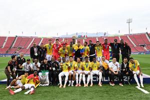 (251019) -- SANTIAGO, 19 octubre, 2025 (Xinhua) -- Imagen del 18 de octubre de 2025 de los medallistas de bronce, el equipo de Colombia, festejando la victoria al término del partido por el tercer lugar entre Colombia y Francia de la Copa Mundial Sub-20 de la FIFA Chile 2025, en Santiago, Chile. (Xinhua/Jorge Villegas) (ah) (da)