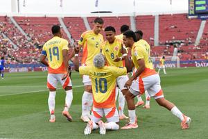 (251019) -- SANTIAGO, 19 octubre, 2025 (Xinhua) -- Imagen del 18 de octubre de 2025 de Oscar Perea (abajo), de Colombia, festejando su anotación con sus compañeros durante el partido por el tercer lugar entre Colombia y Francia de la Copa Mundial Sub-20 de la FIFA Chile 2025, en Santiago, Chile. (Xinhua/Jorge Villegas) (ah) (da)