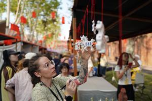 (251018) -- JINGDEZHEN, 18 octubre, 2025 (Xinhua) -- Imagen del 17 de octubre de 2025 de una artista extranjera acomodando sus obras de cerámica en un carnaval de cerámica llevado a cabo como un evento paralelo de la Exposición Internacional de Cerámica de Jingdezhen de China 2025, en Jingdezhen, en la provincia de Jiangxi, en el este de China. La Exposición Internacional de Cerámica de Jingdezhen de China 2025 fue inaugurada el 18 de octubre en Jingdezhen, una ciudad del este de China conocida como la "capital de la porcelana", atrayendo a más de 1.000 compradores nacionales y extranjeros. (Xinhua/Zhou Mi) (jg) (da)