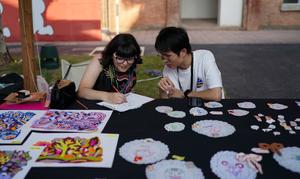 (251018) -- JINGDEZHEN, 18 octubre, 2025 (Xinhua) -- Imagen del 17 de octubre de 2025 de artistas conversando en un carnaval de cerámica llevado a cabo como un evento paralelo de la Exposición Internacional de Cerámica de Jingdezhen de China 2025, en Jingdezhen, en la provincia de Jiangxi, en el este de China. La Exposición Internacional de Cerámica de Jingdezhen de China 2025 fue inaugurada el 18 de octubre en Jingdezhen, una ciudad del este de China conocida como la "capital de la porcelana", atrayendo a más de 1.000 compradores nacionales y extranjeros. (Xinhua/Zhou Mi) (jg) (da)