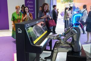 (251018) -- HANGZHOU, 18 octubre, 2025 (Xinhua) -- Invitadas observan un robot tocando el piano durante el Salón Mundial de Poesía, Danza, Música y Artes Visuales, en Hangzhou, en la provincia de Zhejiang, en el este de China, el 18 de octubre de 2025. El Salón Mundial de Poesía, Danza, Música y Artes Visuales se llevó a cabo aquí el sábado como evento paralelo al tercer Foro de Liangzhu. El salón ofrece presentaciones y diálogos sobre civilizaciones, con la participación de más de 20 artistas y estudiosos de la cultura internacionales. (Xinhua/Huang Zongzhi) (jg) (da)