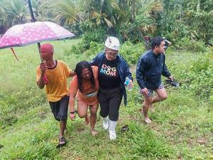(251019) — PROVINCIA DE QUEZON, 19 octubre, 2025 (Xinhua) — Una residente recibe ayuda de las autoridades locales después de que un árbol dañara una casa debido a los fuertes vientos traídos por la tormenta tropical Fengshen, en la Provincia de Quezon, Filipinas, el 19 de octubre de 2025. Ocho personas murieron y dos siguen desaparecidas tras el paso de la tormenta tropical Fengshen por Filipinas el domingo, según informó la Oficina de Defensa Civil. (Xinhua) (ah) (da)