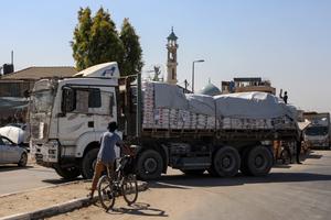 (251019) -- GAZA, 19 octubre, 2025 (Xinhua) -- Imagen del 16 de octubre de 2025 de camiones transportando suministros de ayuda, en Deir al-Balah, en el centro de la Franja de Gaza. Un convoy completo de camiones de ayuda del Programa Mundial de Alimentos logró llegar a un almacén en Gaza sin ser saqueado, y se ha registrado una drástica disminución de los saqueos, declaró el jueves un portavoz de la ONU. (Xinhua/Rizek Abdeljawad) (da) (ah)