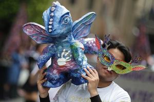 (251018) -- CIUDAD DE MEXICO, 18 octubre, 2025 (Xinhua) -- Un hombre sostiene una escultura de un alebrije durante el 17 Desfile y Concurso de Alebrijes Monumentales del Museo de Arte Popular, en la Ciudad de México, capital de México, el 18 de octubre de 2025. (Xinhua/Francisco Cañedo) (fc) (oa) (da)