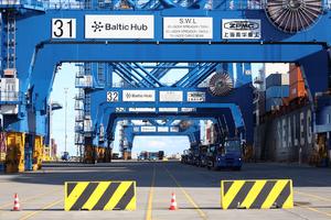 (251019) — GDANSK, 19 octubre, 2025 (Xinhua) — Imagen del 19 de octubre de 2025 de camiones estacionados junto al “Istanbul Bridge”, el primer buque portacontenedores que opera en la ruta exprés de contenedores China-Europa por el Ártico, en el puerto de Gdansk, Polonia. Luego de una travesía de 26 días, el primer buque portacontenedores que opera en la ruta exprés de contenedores China-Europa por el Ártico, llegó la mañana del domingo al puerto de Gdansk, ubicado en la costa del Mar Báltico, en el norte de Polonia. Bautizado como “Istanbul Bridge”, el buque portacontenedores zarpó del puerto de Ningbo-Zhoushan, en el este de China, con un cargamento de unas 4.000 unidades TEU (acrónimo en inglés de Unidad Equivalente a Veinte Pies). Descargará en puertos de Reino Unido, Alemania, Polonia y los Países Bajos. (Xinhua/Cui Li) (ah) (da)