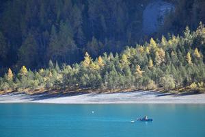 (251019) -- KANDERSTEG, 19 octubre, 2025 (Xinhua) -- Imagen del 18 de octubre de 2025 de un turista navegando en el lago Oeschinen, cerca de Kandersteg, en el Oberland bernés, Suiza. El lago Oeschinen, situado a una altitud de 1.578 metros cerca de Kandersteg, en el Oberland bernés suizo, forma parte del sitio del Patrimonio Mundial de la Unesco "Alpes suizos Jungfrau-Aletsch". (Xinhua/Lian Yi) (oa) (da)
