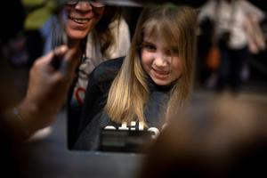(251020) — BUENOS AIRES, 20 octubre, 2025 (Xinhua) — Antonia Leroux (d), de 5 años, observa su reflejo después de cortarse el cabello para donarlo durante la segunda edición de la campaña #UnPelitoMásFácil, en el marco de la conmemoración del Día Internacional de la Lucha Contra el Cáncer de Mama, en una estación del metro de Buenos Aires, en la ciudad de Buenos Aires, capital de Argentina, el 20 de octubre de 2025. El Metro de Buenos Aires organizó el lunes una jornada de donación de cabello para pacientes en tratamiento oncológico, una acción solidaria en el marco del Día Internacional de la Lucha Contra el Cáncer de Mama que se celebra cada 19 de octubre. (Xinhua/Martín Zabala) (mz) (rtg) (ah) (ce)