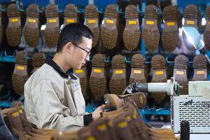 (251020) — BEIJING, 20 octubre, 2025 (Xinhua) — Un empleado procesa un zapato en una compañía, en la ciudad de Gaomi, en la provincia de Shandong, en el este de China, el 20 de octubre de 2025. El producto interno bruto (PIB) de China subió un 5,2 por ciento interanual en los primeros tres trimestres de 2025, según datos divulgados el lunes por el Buró Nacional de Estadísticas. (Xinhua/Li Haitao) (rtg) (ah) (ce)