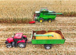 (251020) -- TONGLIAO, 20 octubre, 2025 (Xinhua) -- Vista aérea tomada con un dron el 15 de octubre de 2025 de una segadora trabajando en un campo de maíz, en el distrito de Horqin de la ciudad de Tongliao, en la región autónoma de Mongolia Interior, en el norte de China. (Xinhua/Lian Zhen) (rtg) (ah) (ce)