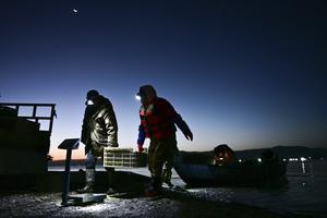 (251020) — GONGHE, 20 octubre, 2025 (Xinhua) — Imagen del 18 de octubre de 2025 de pescadores pesando pescado plateado recién capturado en el área de la Garganta de Longyang, en el distrito de Gonghe de la prefectura autónoma tibetana de Hainan, en la provincia de Qinghai, en el noroeste de China. Cada año, desde finales de agosto hasta finales de noviembre, los pescadores de la Garganta de Longyang se dedican a la captura del pescado plateado. (Xinhua/Qi Zhiyue) (oa) (ah) (ce)
